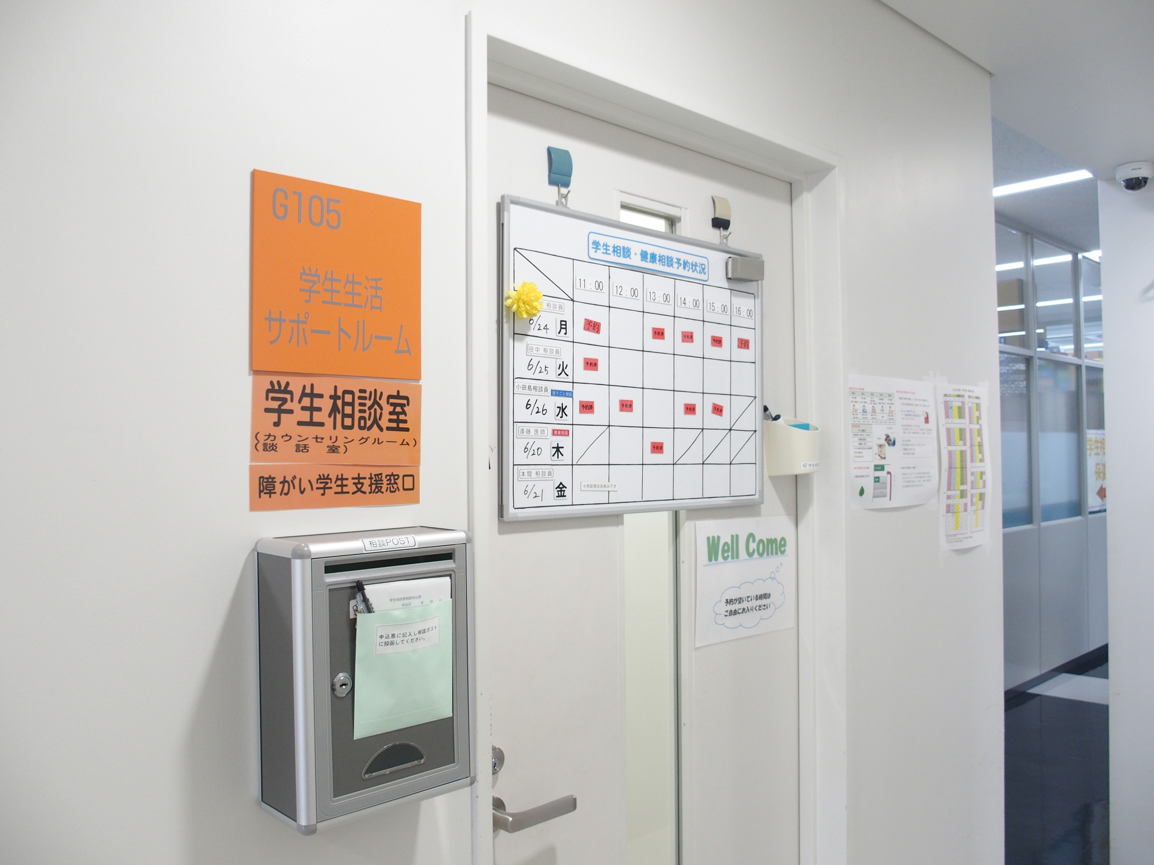 学生生活サポートルーム(待合室)のドア横に相談予約票の投函ポストも 設置しましたので、ご利用ください。